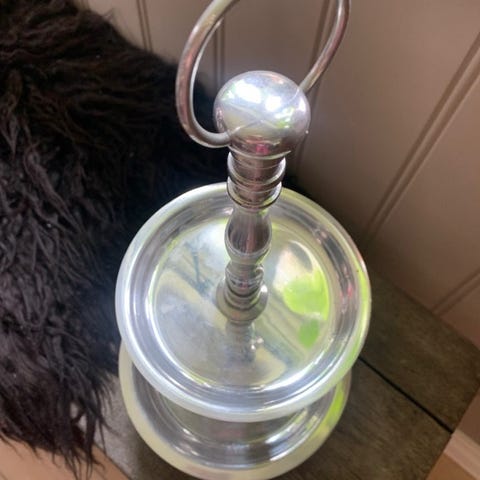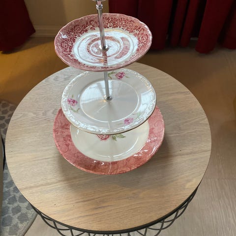 Dekorativt etasjefat med tre nivåer. Fatene har mønster i én rosa sjanger og hvitt, og er egnet for servering eller som dekorasjon. Selges for 300kr. Kan sendes med Fiks ferdig.