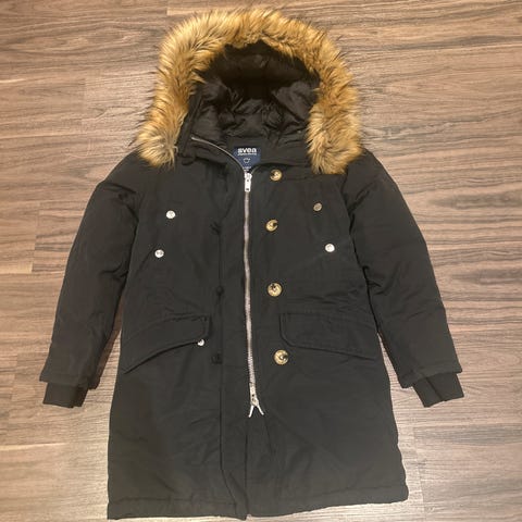 Pent brukt og varm vinterjakke fra Svea i klassisk svart farge. Jakken har hette med fuskepels, glidelåslukking og praktiske lommer. Normal passform og god lengde som gir ekstra varme på kalde dager.