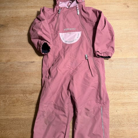 Rosa Alv utedress fra viking. Veldig god med borrelås i halsen, slik at det ikke er behov for hals eller skjerf. Brukt av ett barn denne vinteren. Den ene strikken under foten har røket, så vi har satt på en ny en. Masse god lek igjen i denne dressen!
