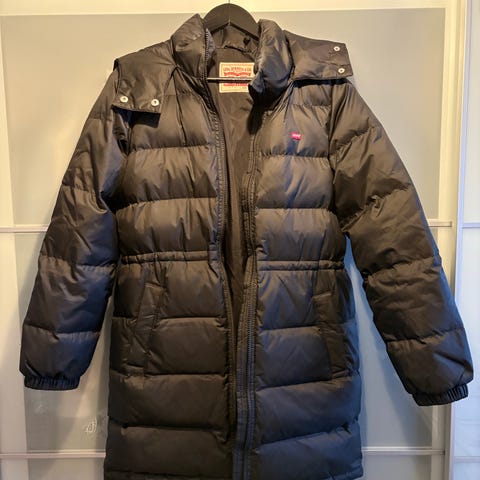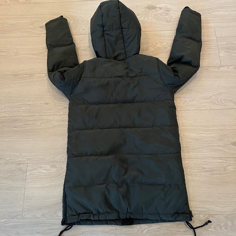 Sort dunjakke . Mellom tykk jakke . Fylt med dun. Str er M. Gull glidelåser. .2 lommer , glidelås i hette og glidelåser på hver sin side ved låra . Veldig pen og lite brukt . Ny pris 999kr . Selges for 300 kr Kan sendes :)