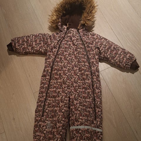 Kjempefin vinterdress fra Kuling i lys rosa, med avtagbar hette (og avtagbar fuskepels). Fleecefor på innsiden, og refleksdetaljer utenpå. Fotstrikker i god stand. Lite brukt.