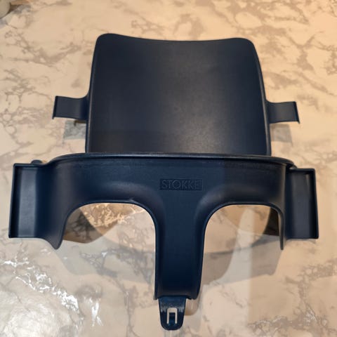 Stokke Tripp trapp-tilbehør selges. Pakken inkluderer babyset, sele, og polstret trekk med klassisk hvit/beige stripemønster.