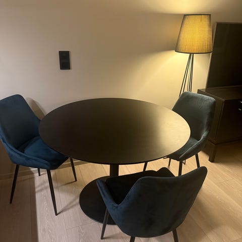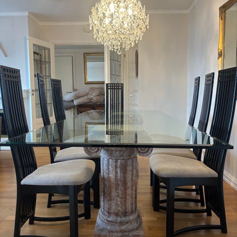 Spisebord m 5 like stoler + 1 stk. annen type inkl. 2 ileggsplater