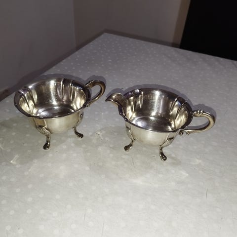 Selger et søtt sukker og fløtesett i sølvplett. 60 g. Trenger en liten puss.