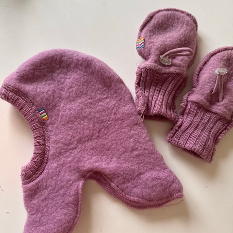Joha ullfleece votter og tøfler i fargen old rose. Størrelse 68/74 (Joha str 70). Pent brukt.