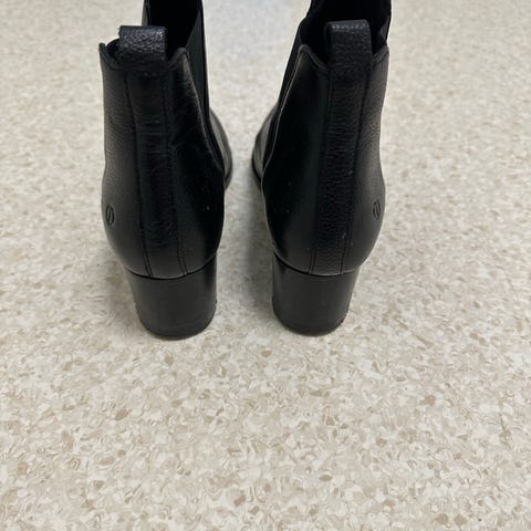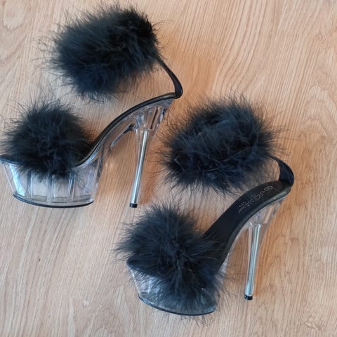 Sko som bare er brukt noen få ganger, men hæltuppen på den ene skoen har ramlet av. Denne utgjør ca en halv cm, kan fjernes på den andre skoen eller repareres av en skomaker eller handy person. Åpen for bud! Skoene har stått i klesskapet de siste årene, uten å være i bruk. Usikker på merke. Skinnimitasjon. Ca 14 cm hælhøyde på skoen som er intakt.
