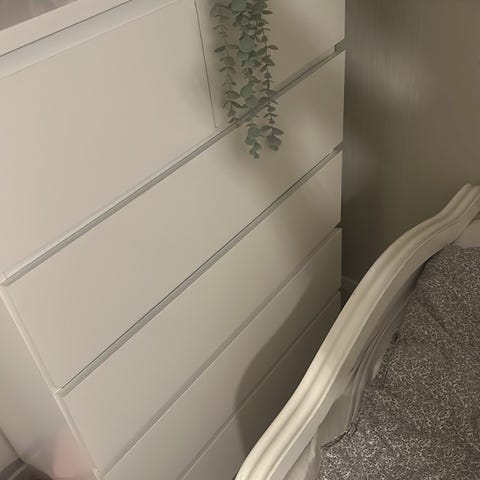 Selger hvit malm kommode med 6 skuffer. I god stand, men selges rimelig da det mangler en liten list mellom to av skuffene. Se bilde.