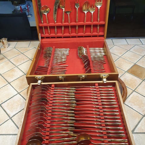 11 kniver, 10 gafler, 10 spiseskjeer + 4 teskjeer selges samlet. (Det var opprinnelig 10 av hver, så hvor den ekstra kniven kommer fra er et lite mysterium!).