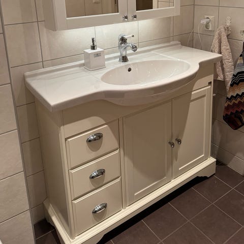 Selger blandebatteri for badekar og dusj, inkl fester fra det svenske merket Mora. Det er noe krakellert på det ene hjuelt som vist på bildet. Det kan også medfølge håndklestativ i samme merke.