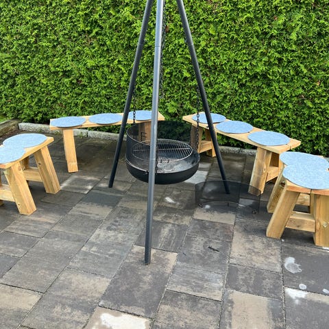 Espegard bålpanne med stativ og grillrist. Bålpannen er utstyrt med en rund grillrist som henger i kjeder fra stativet.