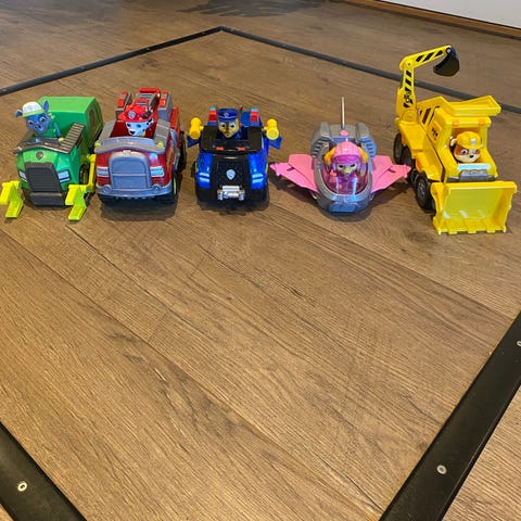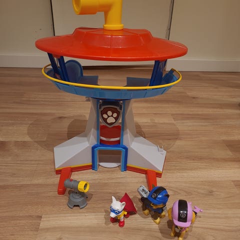 Paw Patrol lekesett som inkluderer et stort tårn og flere små kjøretøy. Pent brukt, selges samlet til kr 600,-