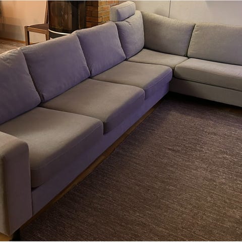 Fin hjørnesofa i grått delikat stoff. Myk og god, og vi skulle gjerne beholdt den, men har behov for noe større. Ryggputene har avtagbare trekk.