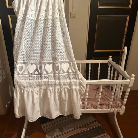 Nydelig babyvugge selges. Kan låse den slik at den ikkje vugger. Har hjul sånn at man enkelt kan flytte den rundt.