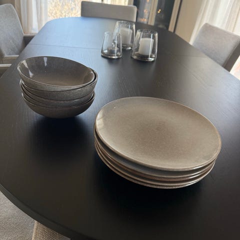 Hele serviset (pakket ikke ut alt, åpnet bare eskene). Asjetter 21x21 cm og middagstallerken 27x27 cm