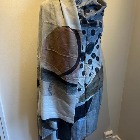 Skjerf/sjal fra Katrin Uri i flott korall og gråfarget mønster. Det måler 75x180. Kjøpt på Finn, men ikke brukt av meg. Lapp er tatt av, men jeg regner med at dette er laget av ull/bomull/kashmir blanding som disse skjerfene vanligvis er laget av.