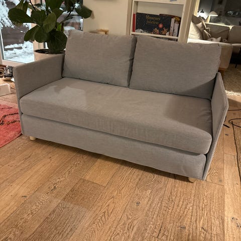 Godt brukt sofa men komfortabel og alt funker som det skal. Fargen er litt slitt og det er en sprek i rommet hvor du oppbevarer sengetøy, men det har ingen praktisk betydning. Trekket kan vaskes og bruksanvisning for montering finner du lett på IKEA's hjemmeside. 4. Etg uten heis, kan hjelpe med å bære ned. Må kjøpes innen 31. Januar
