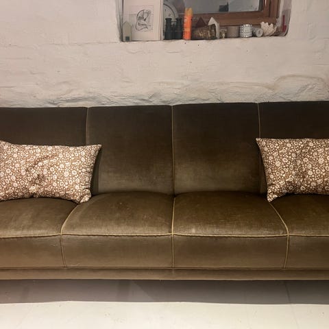 Ukjent merke. Er trukket om på 1980 tallet. Var opprinnelig svart og gul. Armlener og ben i lyst tre. Tror det er eik, eventuelt bjørk. Skjørtet var ikke opprinnelig. Kan tas av ved å fjerne endel små stifter. Selges for kr. 500, eller høystbydende. Må hentes (Sola)