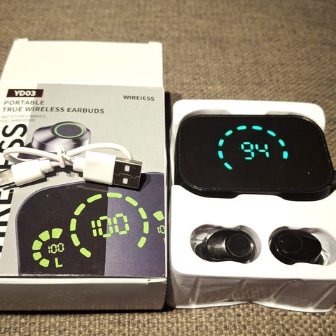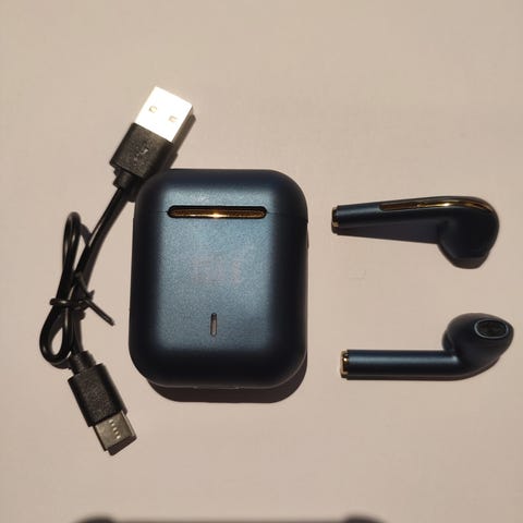 XY - 70 trådløse ørepropper i blå farge. Leveres med ladeetui og USB-kabel. Designet for trådløs bruk med komfortabel passform.