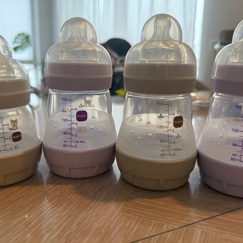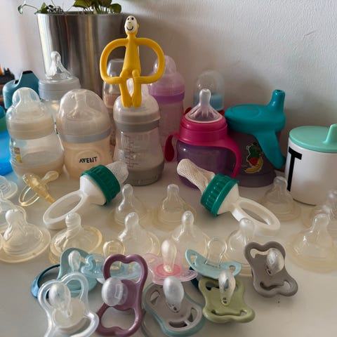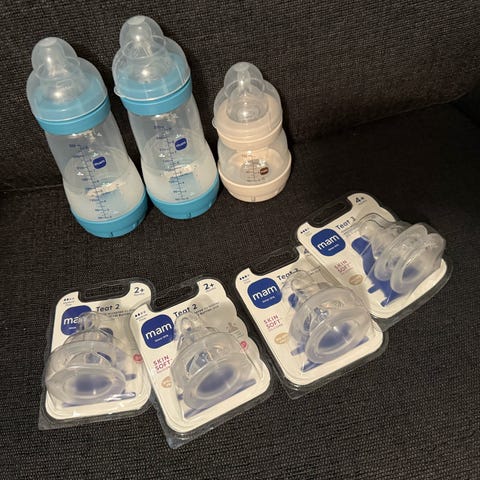 MAM og Avent tåteflasker + flaskesmokker og brystmelkposer – pent brukt