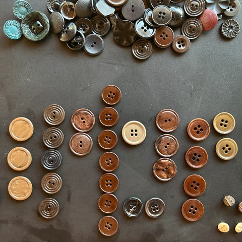 7 poser knapper, mange av hver. Vet ikke antall, men tipper mellom 50 og 100 av hver.