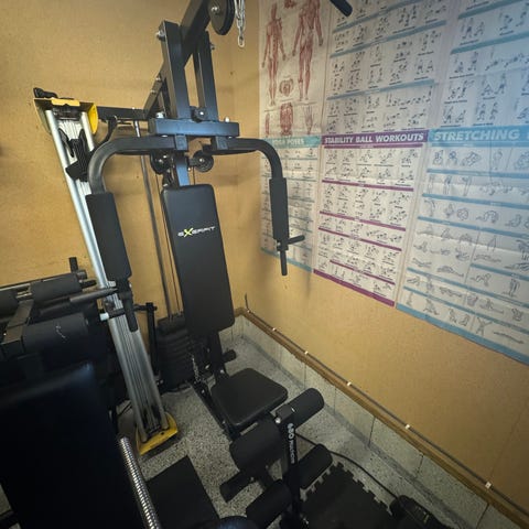 Et multigym-treningsapparat utstyrt med vektstang, polstrede støtteputer og håndtak som muliggjør flere typer øvelser.
