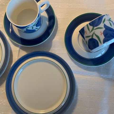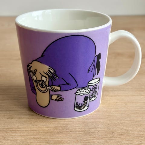 Arabia Mummitrollet kopp i blått og hvitt. Laget av porselen med motiv av Mummitrollet. Passer til daglig bruk som drikkekopp.