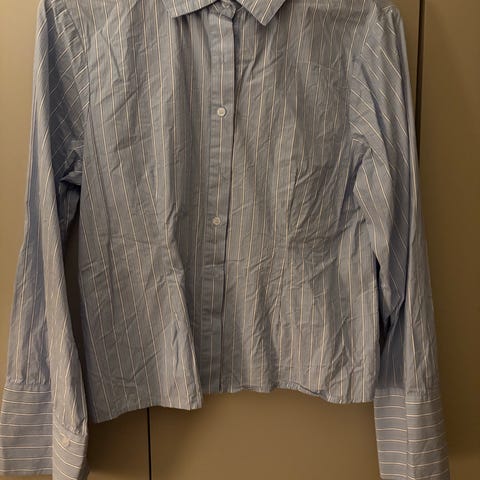 Culture, skjorte i blått med små paljetter. størrelse M, laget av bomull og polyester. Skjorten har knappelukking og stripete mønster.