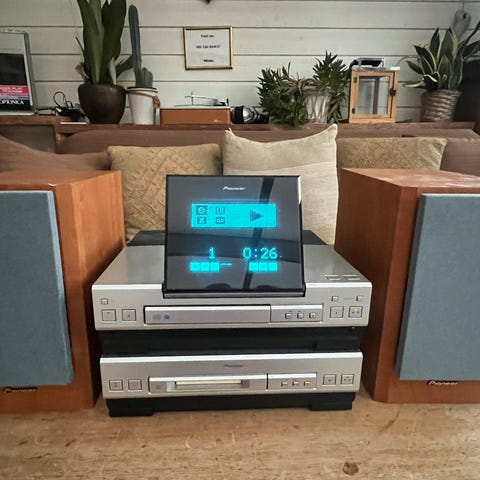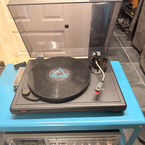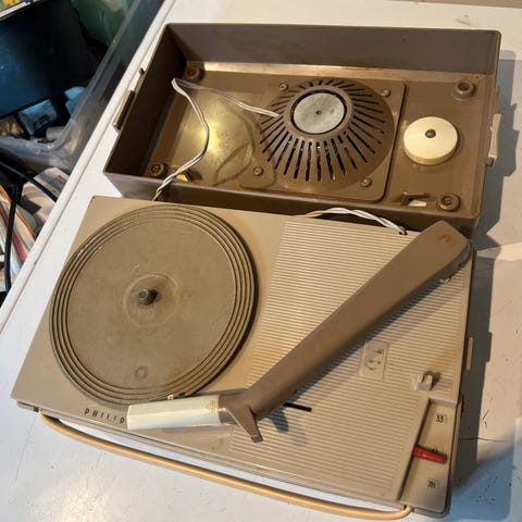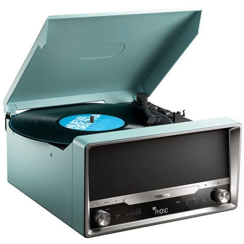 Philips platespiller med integrert radio og kassettspiller. Enheten har kontrollknapper for pause, play, stopp, og innspilling, samt justerbare volum- og tonekontroller. Platespilleren har et gjennomsiktig lokk og en sort plateplate med nål for avspilling av vinylplater.