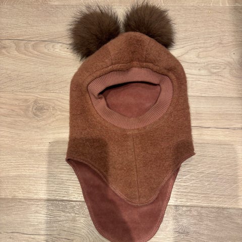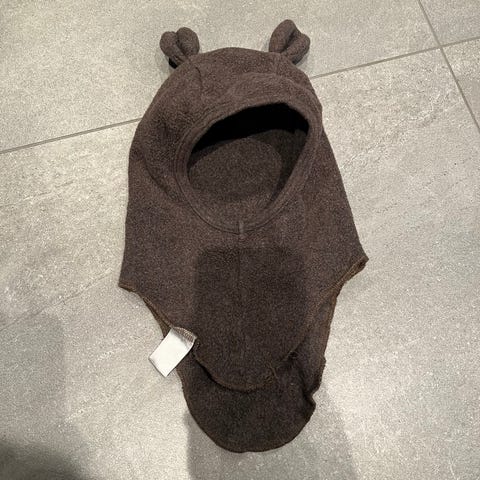 Huttelihut balaclava strl 0-12 mnd, bomull stoff inni og ull på utsiden, veldig lite brukt da den ble vokst fra, god som ny