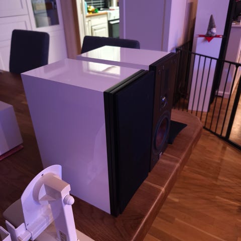 Bowers & Wilkins gulvhøyttalere med svart kabinettdesign i aluminium. Høyttalerne har et moderne utseende med stoffdeksel foran. Egnet for bruk i hjemmelydanlegg.