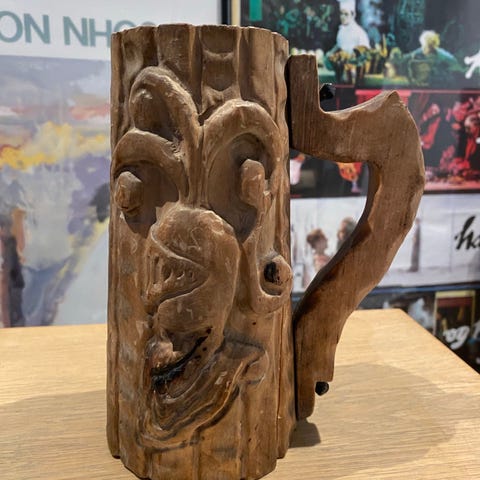 Har to håndtak formet som hestehoder, typisk for norsk folkekunst.
