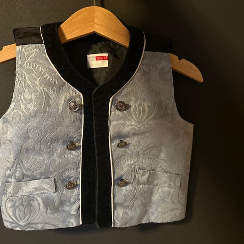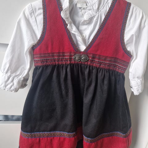 Name it Bunad for jente, størrelse 68. Kjolen har dekorative detaljer og er laget av bomullsmateriale og litt brokade .Bodyen er ren bomull med blondedetaljer i gult.Veldig pen og uten flekker. Fra røykfritt hjem.
