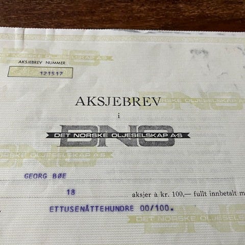 Nr 3 har 8 aksjer a100 kr utstedt juli 1985. Signert av representanter for Den norske Creditbank.