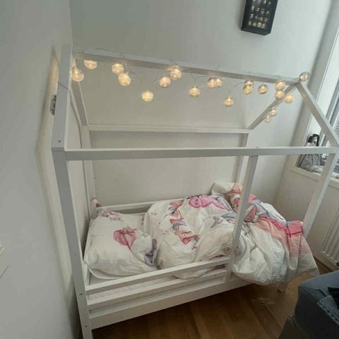 JLY Juniorseng laget for barn. Sengen er i tremateriale og har en hvit finish. Produktet viser bruksmerker og skader på treverket(knekt tre planker, kan lett byttes ut). Passer som juniorseng/gulvseng for barn. Føller med bein og skruer.
