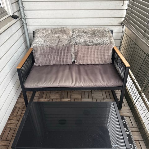 Kjøpt på Jysk for 2,5 år siden. Er veldig pent brukt. Har stått under tak på sommeren og inne i bod om vinteren. Har vært svært lite eksponert for sol.