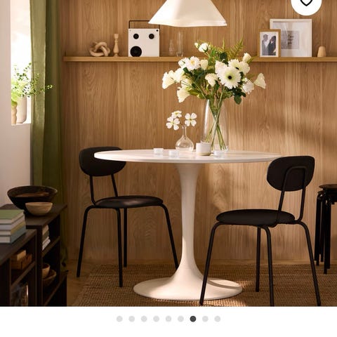 Pent rundt svart spisebord/kjøkkenbord med innebygget klaff som vist på bilde. Total lengde 165 cm med klaffen i bruk ellers er 115 cm.
