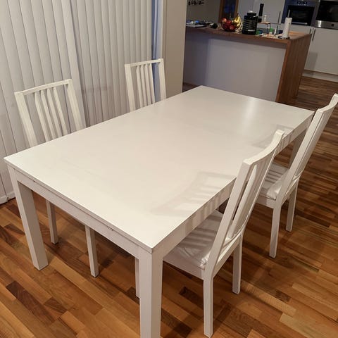 Selger uttrekkbart spisebord fra IKEA pga flytting. Lite brukt og ser pent ut. Har illeggsplate og passer til 4-6 seter - kan kanskje skvise inn to på sidene også. Størrelse på bord når det er trekket ut er 180cm. Må hentes veavågen. Pris kan diskuteres ved rask henting.