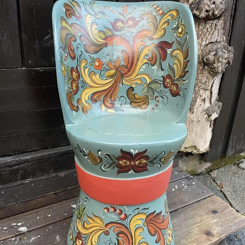 Antikk kubbestol med håndmalt dekorasjon i grønt, rødt og svart. Kubbestolen har detaljerte mønstre. Den viser tegn på alder og bruk, inkludert slitasje og sprekker i treverket men har fortsatt verdi som stol eller dekorasjon.