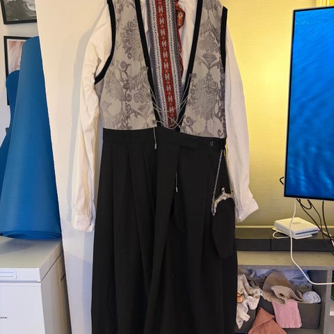 Pent brukt festdrakt til dame med cape fargen er svart skjørt burgunder overdel og brun kep