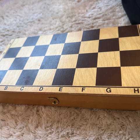 sjakkspill med brett og brikker i tremateriale. Brettet har rutemønster i to farger. Spillet leveres med brikker i to farger, lagret i en sammenleggbar boks. Passer for sjakkspillere.