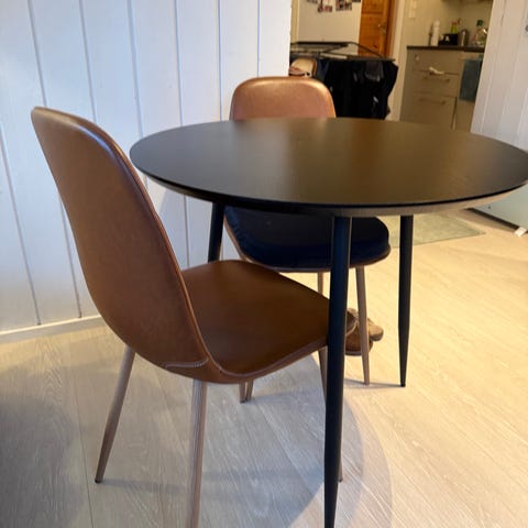 Selger rundt glassbord i sort farge. Noen merker på kantene, ellers fin.
