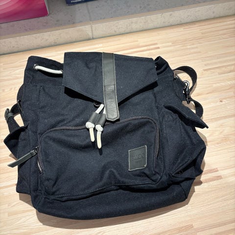 Stellesekk (sekk) fra merket Kaos. Pent brukt. Finner dessverre ikke reima for å kunne henge den over styre på vognen, men det finnes flere måter å feste den på. Stellematte kan følge med, men den er noe slitt.