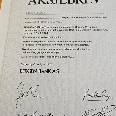 Bøndernes Bank Aksjebrev, 5 stk fra 1970-1983
