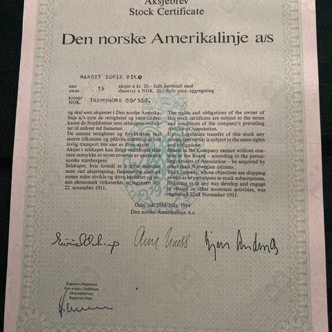 Nr 1 , 15 aksjer a kr100, utstedt i 1970, ingen merker