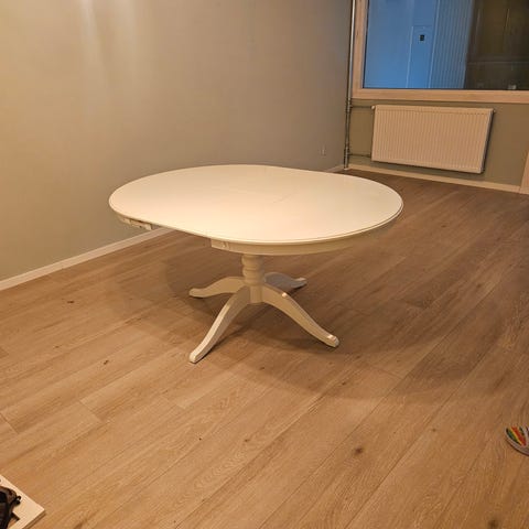 Gir vekk et lite hvit spisebord. Solid tre og stabilt. Som man ser i bildene, finnes det flekker på overflaten og utvidelsesplatene er umalte. Bordplatene kan lagres inni selve bordet.