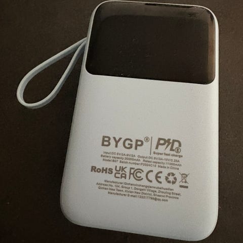 Powerbanken ble kjøpt 10.12.2023 og har nesten ikke blitt brukt. Den er funksjonstestet og fungerer per nå normalt: den tar lading uten problemer, lader andre enheter som den skal, display/prosentvisning fungerer, og innebygd lys fungerer.