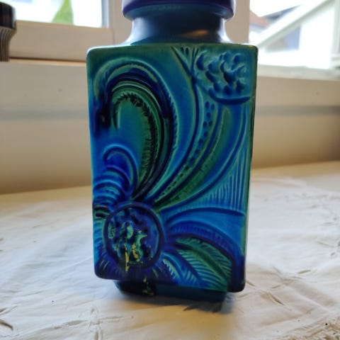 Vasen har vakker blomsterdekor i relief med varme jordfarger på mørk bunn. Tykk glasur og tidstypisk utførelse. Innpreget modellnummer i bunnen.