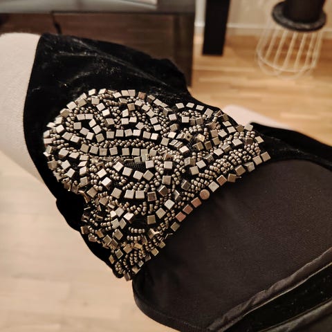 Den er dessverre blitt for liten. Er knyting nede og har knappestolpe. Strikk rundt hender. Den er mørkegrønn i bunnen. Vanskelig å få fram fargen.