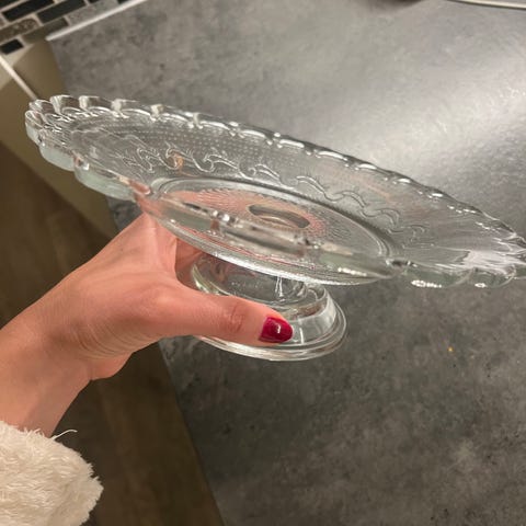 &Tradition kakefat laget av glass med en dekorativ sølvfarget base. Fatet har et mønster med riller og en sentral dekorasjon. Egnet for servering av kaker og andre bakverk og frukt