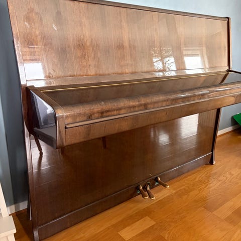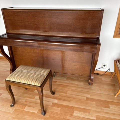 L. Schmidt upright piano i treverk. Pianoet har to pedaler og et klassisk design. Passer til bruk i hjem eller undervisning. Tidligere kjøpt av pianist ved det norske operaen. GIS BORT!